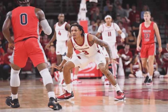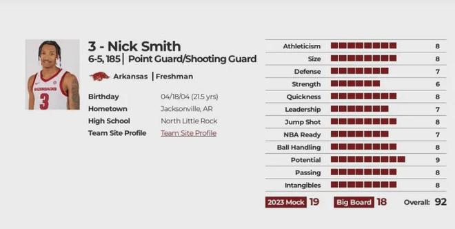 现在我们来回看他在2023年6月最后一份选秀报告(略有删减),综合评分92分,选秀模板贾马尔-克劳福德,预计选秀顺位首轮18-19位。 优势:一名双能卫,身高1米88,体重84公斤,拥有NBA级别的臂展和运动能力,速度极快,还有增肌潜力,他喜欢得分(大一赛季场均12.5分),而且得分手段非常丰富,尤其擅长持球突破后投篮,状态好时可以连续得分(大学17场比赛中有5场得分超过20分),被认为是一位“微波炉式”得分手,他突破防守应该不成问题;拥有良好的控球能力和快速的第一步启动速度,中距离投篮也很稳,能凭借急停跳投给防守者施加压力,在内线也能运用抛投,偶尔还凭借灵巧的技术和手感在篮下完成一些精彩上篮,他不惧远投,本赛季也展现出一些远投能力(场均三分出手超过4次,命中1.4球),既能持球进攻也能打无球,能积极切入或寻找空位投篮机会,具备成为一名高效得分后卫的所有素质。 拥有出色的防持球潜力,具备足够的速度和臂展来干扰传球,有威胁的抢断者,凭借速度和积极进攻风格,非常适合快节奏进攻体系;作为一名快攻型球员,拥有良好的发展前景。