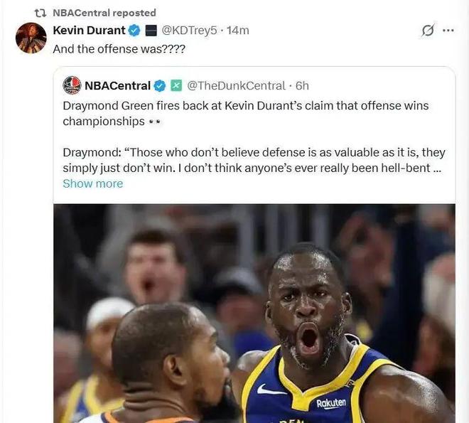 很快,格林就对杜兰特的言论做出回击: “他的话有点让人费解..." 追梦还强调,防守对总冠军球队至关重要 不相信这一点的人,注定永远赢不了冠军 那些低估防守价值的人,注定与胜利无缘 我从来不会在意失败者的观点,毫无价值