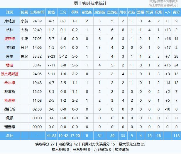 太阳数据(客队):布克38分3板4助、威廉姆斯16分16板4助、阿伦16分4板5助3断、邓恩10分2板1助3断2帽、奥尼尔8分6板3助、吉莱斯皮8分5板4助、古德温5分3板1助、伊戈达罗2分5板1助2帽、利弗斯2分2板1助、理查兹2分1助 勇士数据(主队):库里28分4板3助、穆迪24分5板2助、波斯特14分6板3助2帽、波杰姆斯基13分2板4助、希尔德12分2板2助、库明加9分5板2助、斯潘塞7分3板4助2断、戴维斯7分2板3助、格林2分6板8助、巴特勒2分4板2助