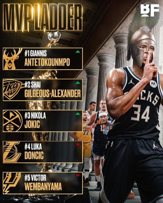 这也是开季至今字母哥身旁处境的缩影,本赛季在利拉德离队后,字母哥的比赛统治力进一步提升,攻防两端可谓是当爹又当妈。 场均要轰下32.3分12.6篮板6.3助攻全能数据,同时投篮命中率高达67.7%,如果不是本场比赛提前打卡,这一数据还会更加夸张。 凭借这样的表现,字母哥在美媒《BF》公布的最新一期MVP榜单中力压亚历山大高居联盟第一。