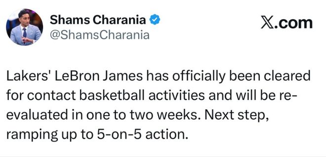 今天,来自Shams的权威消息,詹姆斯已获准参加5VS对抗训练,1-2周后将重新评估伤情。 最新消息是,詹姆斯预计将在11月中旬复出。 此前报道,詹姆斯将不会随队出征湖人接下来的5连客,他将随着南湾湖人队训练。 问题来了,他是想超越儿子在南湾湖人的得分纪录吗? 湖人将在11月9日开启5连客,对手分别是:老鹰、黄蜂、雷霆、鹈鹕、雄鹿。随后11月19日湖人将主场对阵爵士。 如果一切顺利,11月19正好又是11月旬的最后一天。 爵士又新增一项业务,专业承包巨星复出! 詹姆斯如果真的在11月19日复,算起来,他已经缺席了赛季前14场比赛,留给詹姆斯角逐最佳阵容等奖项的评选资格,只剩4场可以休息。 伤愈复出,漫长的赛季,41岁的高龄,65场比赛,这对现在的詹姆斯来说,几乎是不可能完成的任务。