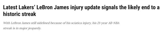 湖人官方更新詹姆斯伤情!本季难获评奖资格: