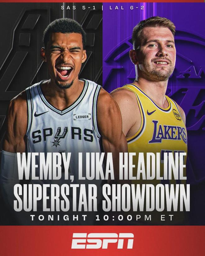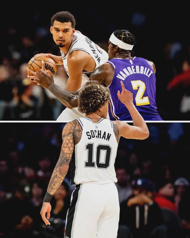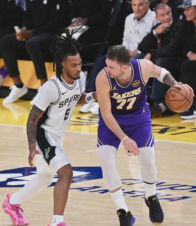 说回比赛,艾顿和八村塁轮流把文班亚马顶出禁区,不让他在篮下轻松得分。上一场太阳就是这个防守策略,当时文班14中4仅得9分。今天比赛第一节,文班依然找不到准星,4投1中得到2分3篮板1盖帽。尚帕尼4中3,单节9分进账。 第一节打完,马刺29-26领先3分。里夫斯不打,湖人只能依赖东契奇。东契奇打满第一节,11投4中得到13分5篮板3助攻3抢断2盖帽。第二节文班想要发力,先是顶飞布朗尼,跳投得手。接下来上演天外飞仙,在布朗尼面前暴扣! 本以为文班亚马要接管进攻,没想到斯玛特开始发力:一攻一防,连续造成文班亚马2次犯规。第二节还剩8分多钟,文班3次犯规只能下场。东契奇很快也是3犯,不过湖人并不敢将其换下。东契奇上半场狂轰22+6+7,率领湖人反超!