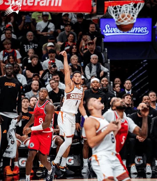 第四节决战,杰伦-格林急停背运停球晃开防守,撤步后仰中投打进,接着三分强投再中,已经砍下29分,布克微笑鼓励,太阳首秀打得太过于惊艳了。吉莱斯皮反击送助攻,邓恩起飞滑翔单手空接劈扣,太阳继续保持20分左右分差,泰伦卢提前换上全替补阵容,比赛再无悬念,最终,太阳轻取快船,送给对手3连败。