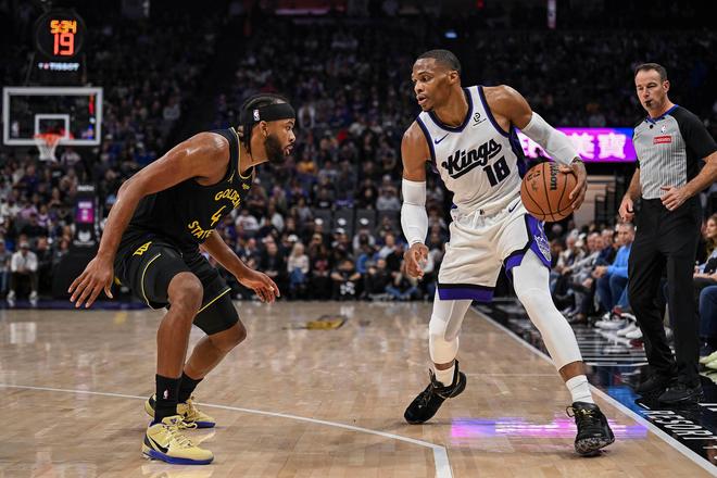 国王擒勇士队 NBA常规赛争夺继续,国王坐镇主场迎来与勇士队的较量,本场库里、追梦、巴特勒、小萨与拉文数名核心球员均缺席,最终残阵国王121-116击败同样是残阵的勇士队。 由于两队都是残阵,反而给了部分此前轮转不太靠前的球员足够的自证机会,其中就包括身背底薪的威少,他再度轰下三双刷爆纪录成为NBA历史首人。