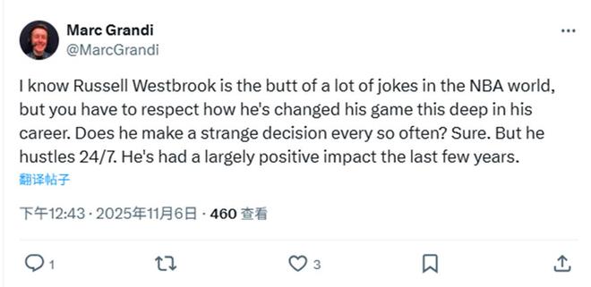 美媒纷纷惊叹 面对威少这样的表现,美媒纷纷感叹与惊讶威少在刚刚过去的这个休赛期竟然一度无人问津,一直在等待重返NBA的机会,并且最终仅签下底薪。 其中美媒NBACentral转发威少数据配文到:“不敢相信威少整个夏天都在寻找工作。” 美记Marc Grandi则更加真诚的表示:“我知道NBA世界中有很多人都会拿威少来开玩笑,但你不得不佩服他在职业生涯后期如此出色地改变了自己的比赛方式,哪怕他偶尔会做出一些奇怪的决定,但他24小时永远保持拼搏,过去几个赛季一直交出积极正向的表现。”
