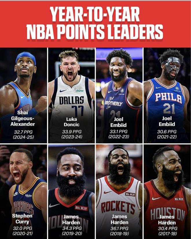 NBA新赛季已经开始,每逢新赛季开始,关于“谁才是联盟最会得分的人?”的话题都会被重新提起。回望近16季的常规赛场均得分王,从杜兰特的青春登基,到哈登的高产时代,再到恩比德与东契奇的内外线统治,近年谢伊的崛起又把话题推高。下面这份年表按赛季逐一列出常规赛场均得分王,可作为我们判断新季风向与“得分话语权”流转的参照。 赛季:2009-2010杜兰特 (Kevin Durant) 国籍:美国 俱乐部:俄克拉荷马城雷霆 场均得分:30.1 年龄:21 赛季:2010-2011杜兰特 (Kevin Durant) 国籍:美国 俱乐部:俄克拉荷马城雷霆 场均得分:27.7 年龄:22