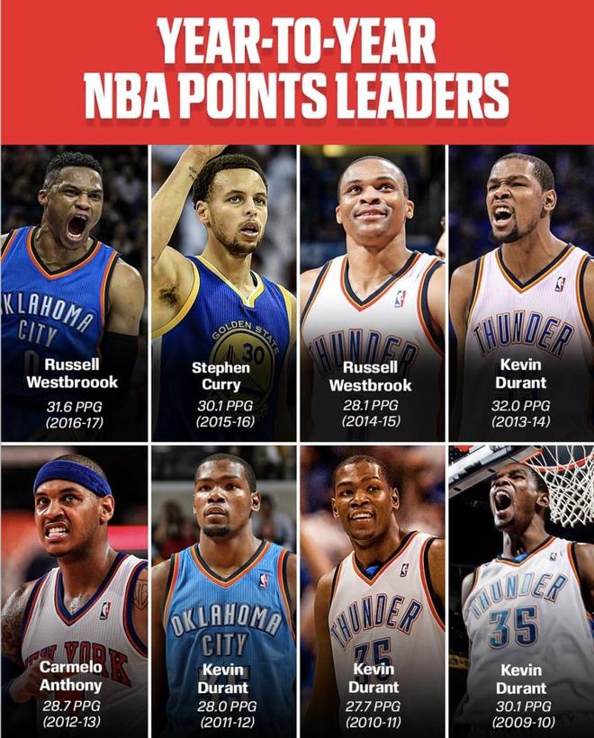 赛季:2013-2014赛季:杜兰特 (Kevin Durant) 国籍:美国 俱乐部:俄克拉荷马城雷霆 场均得分:32.0 年龄:25 赛季:2014-2015威斯布鲁克 (Russell Westbrook) 国籍:美国 俱乐部:俄克拉荷马城雷霆 场均得分:28.1 年龄:26 赛季:2015-2016库里 (Stephen Curry) 国籍:美国 俱乐部:金州勇士 场均得分:30.1 年龄:28