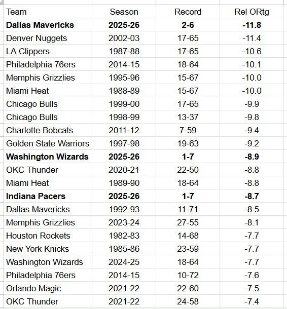 你没有看错,汤普森在场时独行侠百回合连90分都拿不到,而且他的of/off值低至-22.2,这种情况发生在一位四冠王、历史最佳三分手之一身上,实在是非常疯狂。 多说一句,这赛季的独行侠,开局2胜7负西部垫底,很大一部分原因就是因为进攻不行,一个数据是,本赛季独行侠的相对进攻效率(球队进攻效率-联盟平均效率)只有-11.8,这个数字不仅仅是本赛季最差,甚至还是历史最差——看至此,你大概能理解为何这才开赛不到10场比赛,独行侠就想着交易汤普森了。