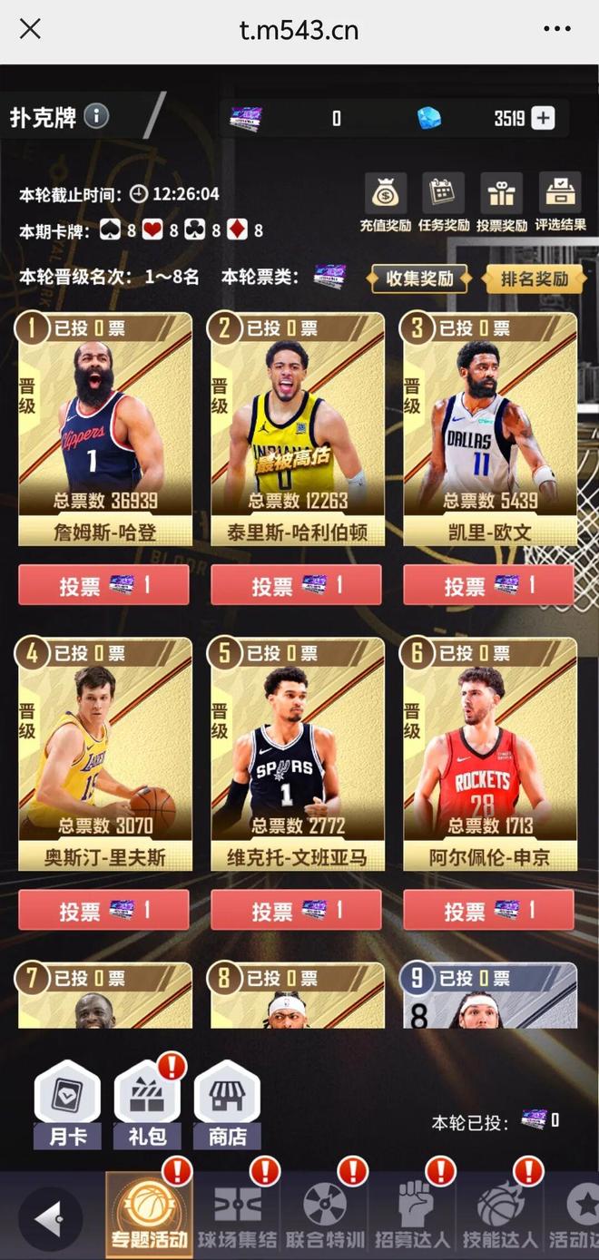或者...去湖人找你心爱的77吧? NBA英雄2票选本赛季扑克牌来了! 现役联盟球星,你会把票投给谁? 今天是哈登、哈利对决,谁晋级! 每天免费1票!投票后还能赢取宝箱!
