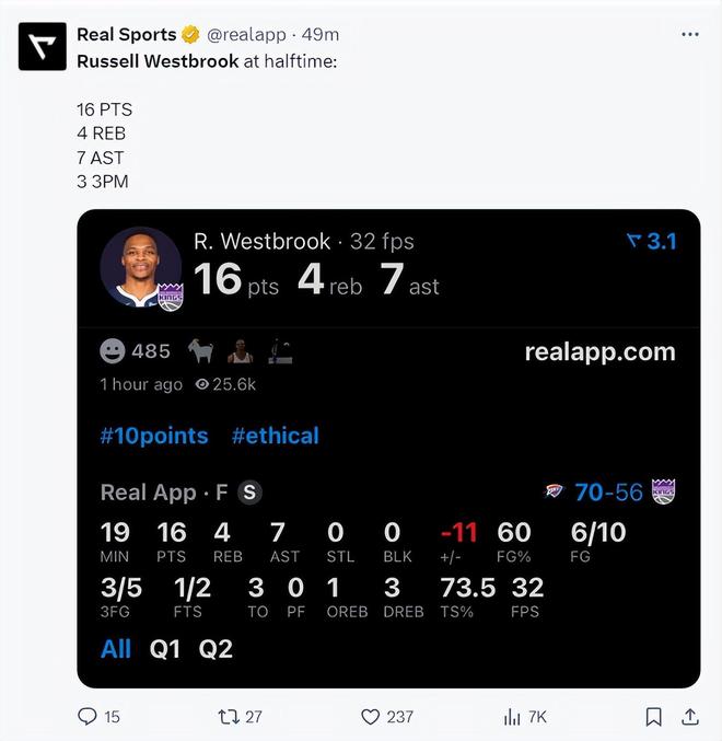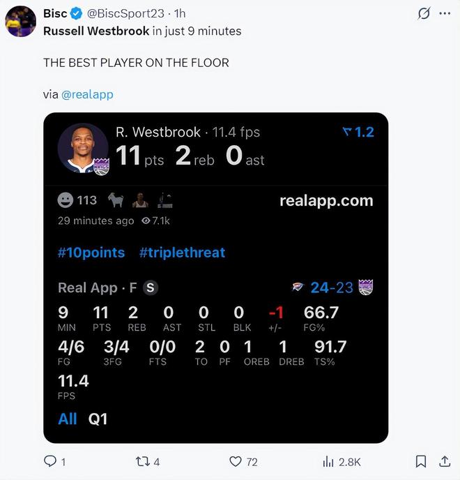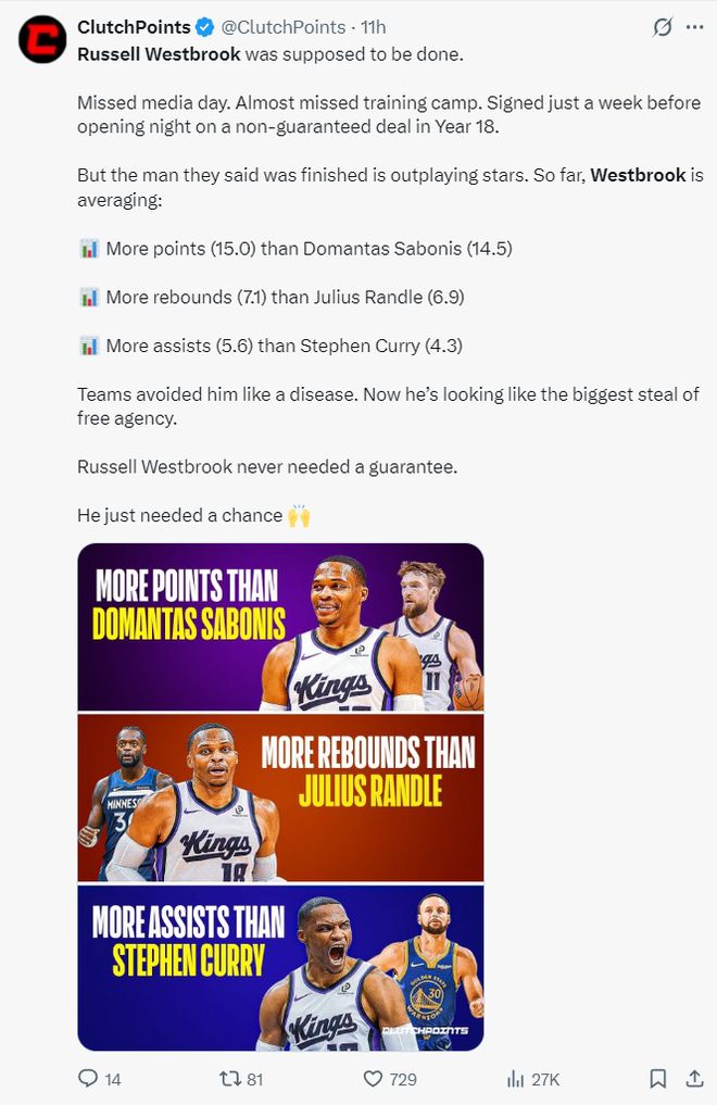 赛前美媒Clutchpoints写道:威少本该就此退役,错过了媒体日、错过了训练营,开赛前一周才签下一份无保障底薪。 但濒临退役的他却发挥如此出色,场均得分高于小萨,场均罚球高于兰德尔,场均助攻高于库里。 各队都对他敬而远之,仿佛他就像瘟疫一样,如今他却成为国王自由市场签下最成功的运作。威少从来没有获得应有尊重,他只是需要一个机会。