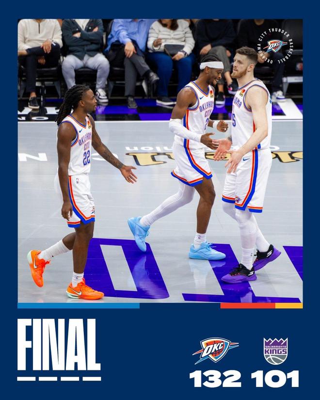 第4节,米切尔连续送出助攻,OKC依靠着团队作战,得以将分差扩大至34分,比赛早早失去了悬念。萨克拉门托追分乏力,最终,雷霆以132比101完胜对手。 两队数据 国王队,施罗德10中0,三分球5中0,罚球2中2得到了2分2板8助,在进攻端疯狂打铁。德罗赞13中7,三分球7中4得到18分5板3助、尤班克斯11中8贡献16分1板2帽、蒙克9中6得到15分3板1助、拉文5中3得到9分2板2助、雷诺8分10板1助、阿丘瓦4分4板、埃利斯3分1板、卡特2分1板1助、克利福德3板2助。 雷霆完胜国王