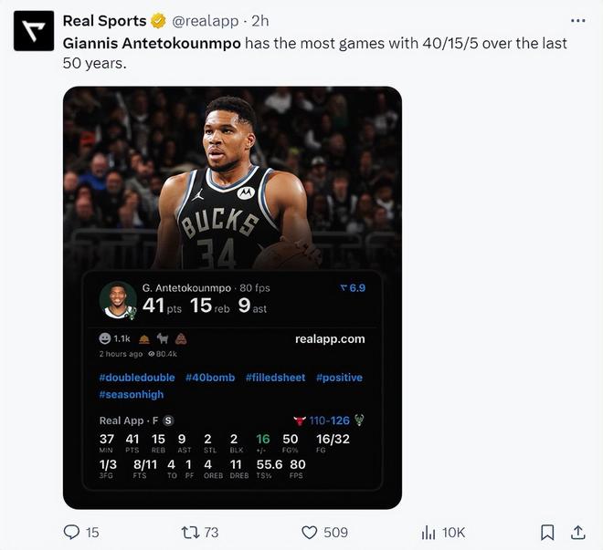 末节19分万夫莫敌!字母哥41+15又刷纪录 美媒晒数