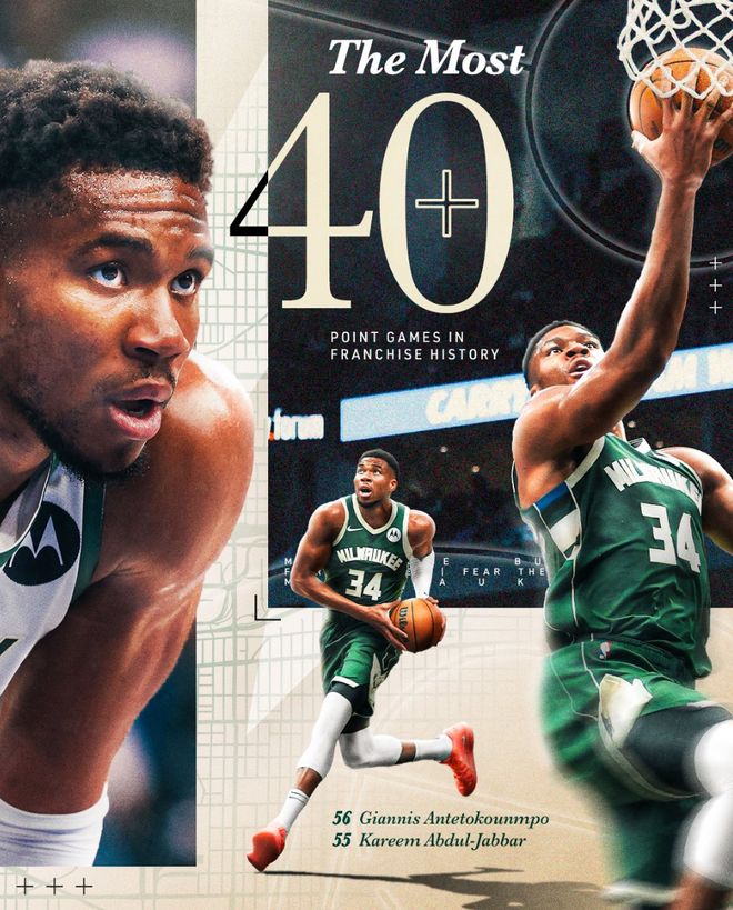 此役扬尼斯还一战创造多项纪录: 1.拿到本赛季第二次40+10+5; 2.雄鹿队史56次40+超过贾巴尔成为队史第一人; 3.过去50年里扬尼斯有联盟最多的40+15+5