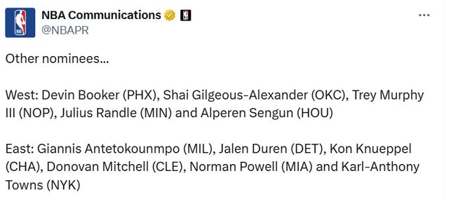 西部:布克(太阳)、亚历山大(雷霆)、墨菲(鹈鹕)、兰德尔(森林狼)、申京(火箭) 东部:字母哥(雄鹿)、杜伦(活塞)、克努佩尔(黄蜂)、米切尔(骑士)、鲍威尔(热火)、唐斯(尼克斯) |