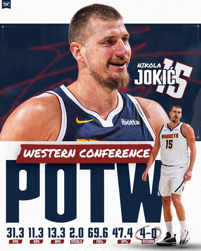 西部周最佳:约基奇(掘金) 这是约基奇本赛季首次斩获该奖项,其职业生涯至今已18次当选西部周最佳球员,在掘金队史上排名第一。 过去这一周,30岁的约基奇场均贡献31.3分、11.3个篮板、13.3次助攻和2.0次抢断,投篮命中率达69.6%,三分命中率为47.4%,带领掘金队取得了4胜0负的不败战绩。