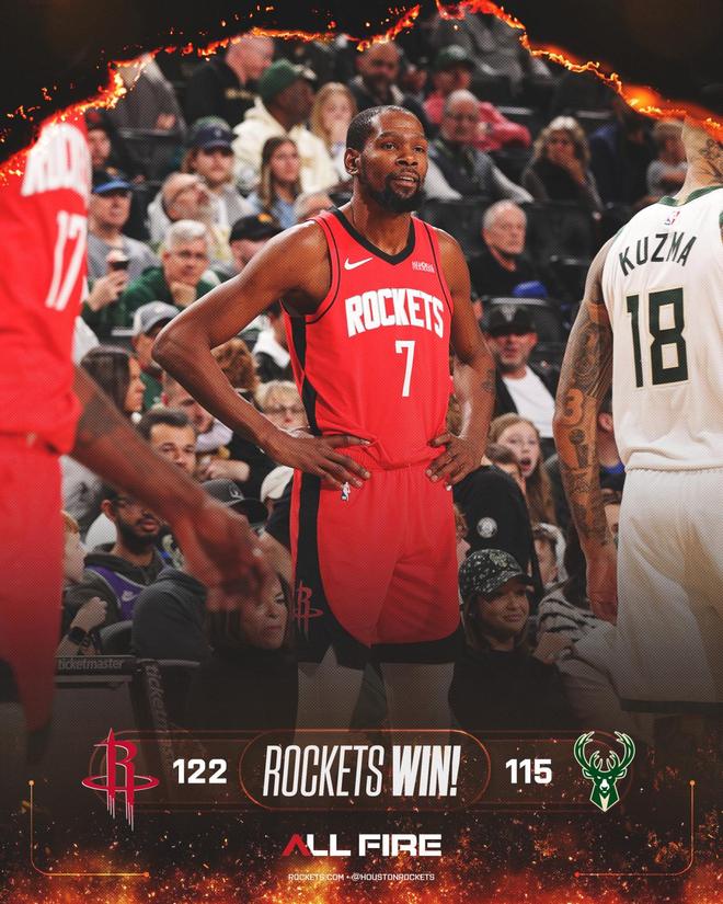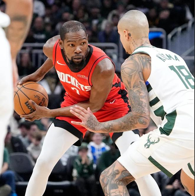 此战,字母哥还创下了NBA历史第1的神迹。字母哥本赛季9场比赛已经得到至少300分100篮板50助攻,NBA历史最快。 杜兰特31+7创纪录 火箭队超级球星凯文杜兰特,在此战强势暴走。杜兰特上场37分钟,15投11中,三分2中2、罚球9中7,狂轰31分3篮板7助攻的全能数据。杜兰特以73%的超高命中率,轰下了全队的最高分。并且,杜兰特还有着100%的远投命中率。作为全队走上罚球线次数最多的球员,杜兰特坚决冲击篮下,展现了强大的求胜欲望。 凯文杜兰特