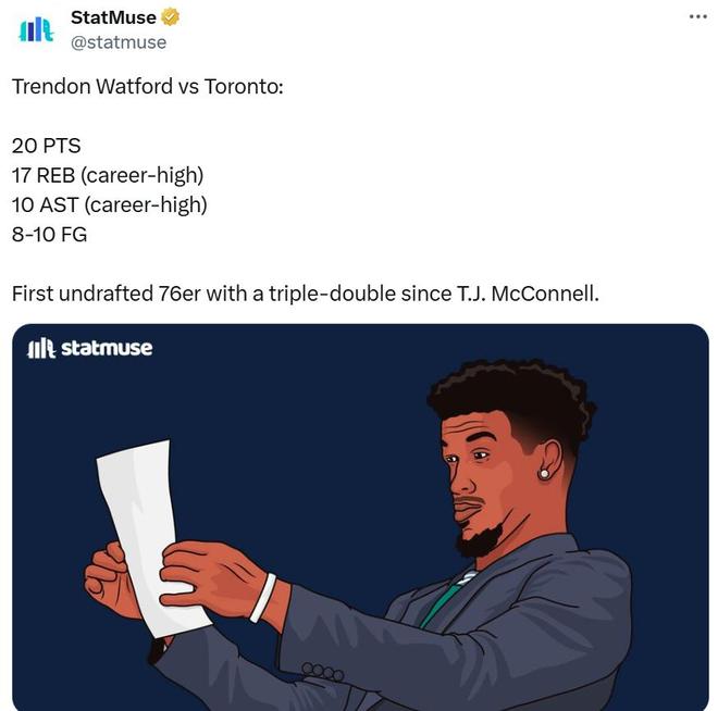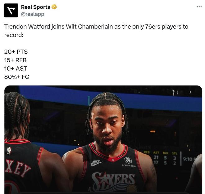 相比于传奇巨星张伯伦,沃特福德只是21年的一名落选秀,本场交出这样的表现显然更加励志。 也让其成为76人队史自TJ-麦康奈尔后,首位能够砍下三双的落选秀。