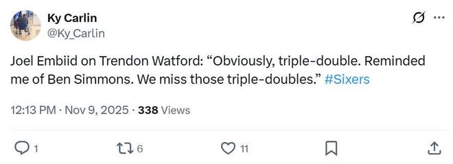 面对沃特福德如此神奇的表现,赛后76人主帅纳斯称赞到:“他就是我们所有人认知中那种纯粹的篮球人。” 沃特福德的三双表现更是勾起了恩比德的美好回忆,赛后直言:“是的,他做到了,他让我想起了本西蒙斯,怀念那些三双。”