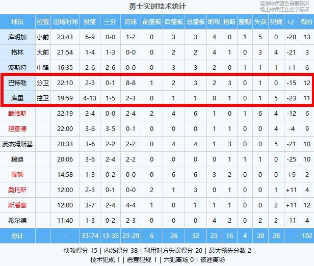 看数据:有3大罪人! 头号罪人(库里):13中4得11分1篮板1抢断,正负值-23!开局一上来3中3随后各种不中,背传失误+生涯首次恶意犯规,下半场依旧毫无发挥,输球头号罪人!