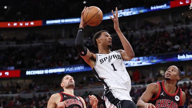 此役,雄鹿队球星扬尼斯阿德托昆博18中11,以61.1%的命中率轰下了30分8篮板6助攻1抢断3盖帽。末节,字母哥独得15分,在进攻端大杀四方,帮助密尔沃基锁定了大局。此役之后,字母哥是以60%命中率砍下30+5+5场次数第二多的球员(143次),仅次于勒布朗詹姆斯(224次)。 不过,马刺球星文班亚马的表现更为惊艳。在圣安东尼奥与芝加哥的比赛里,文班亚马19中11,三分9中6,罚球10中10,狂轰38分12篮板5助攻1抢断5盖帽的超级两双数据。攻防两端暴走的文班亚马,在串联球队方面也有着突出的贡献。 马刺队文班亚马