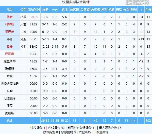 老鹰数据:克雷伊奇28分3板2助、波尔津吉斯20分3板4助3帽、约翰逊16分10板8助、里萨谢11分5板3帽、奥孔武10分6板3助、肯纳德7分4板2助、丹尼尔斯6分3板8助3断、华莱士5分4板1助、盖耶2分3板2助 快船数据:哈登35分10板11助2帽、祖巴茨13分12板1助2帽、琼斯11分2板2助2断、邓恩11分2板2断、科林斯9分7板、布朗9分2板、洛佩斯9分2助、克里斯蒂3分3板3助、巴图姆2分4板