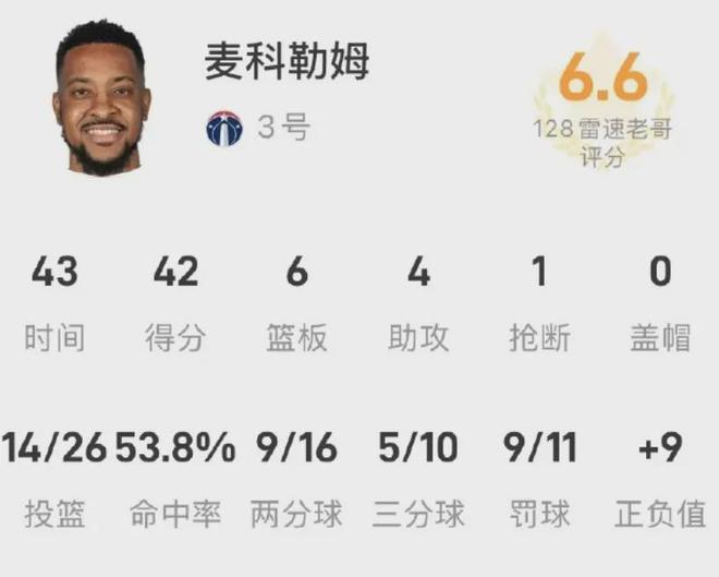 活塞主场迎战奇才的比赛,关注度更低,但同样精彩。 CJ·迈克勒姆“老夫聊发少年狂”,单场狂轰42分6篮板4助攻1抢断,差点就率领奇才在底特律抢下一场胜利,但康宁汉姆没答应。