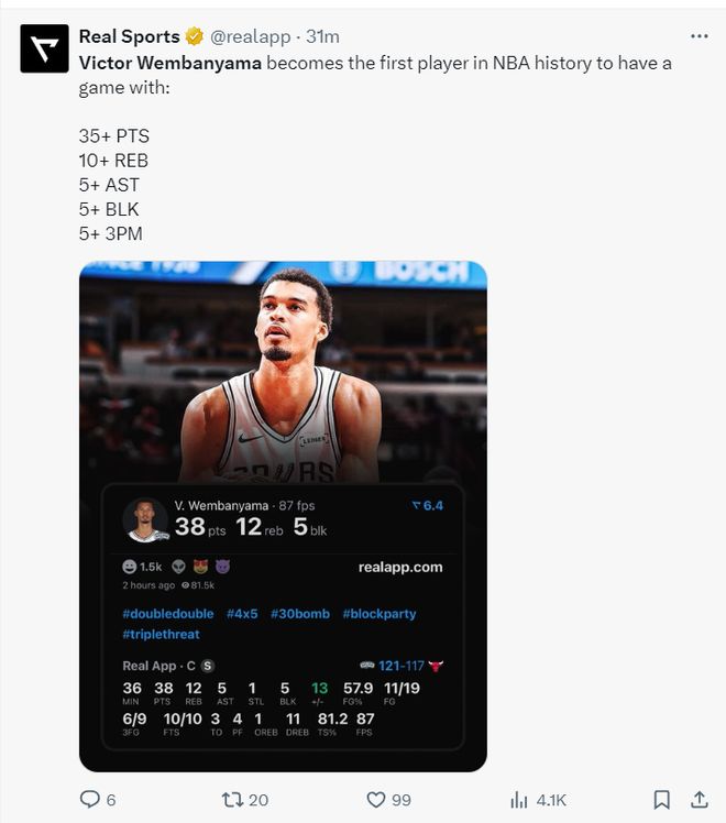这场比赛文班亚马一战创造多项纪录:1.连续95场比赛送出封盖历史第三; 2.成为NBA历史上最年轻连续95场送出封盖的球员; 3.单场至少35+10+5+5盖帽+5三分历史首人; 4.超越邓肯成为单场30+10+5+5帽次数成为历史第四; 5.6次单场5三分+5封盖历史最多,又是历史首人纪录; 6.单场5篮板、5助攻、5盖帽、5三分第三次,历史其他人1次;