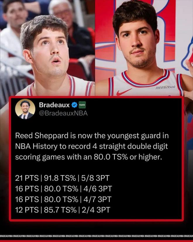 需要说的是,谢泼德的状态已经持续一段时间了,本场之前的三场比赛,他的表现: ——对阵灰熊,投篮7中5,三分4中2,得到12分2抢断,真实命中率85.7% ——对阵马刺,投篮10中6,三分7中4,得到16分6助攻,真实命中率80.0% ——对阵雄鹿,投篮10中6,三分6中4,得到16分2助攻4抢断,真实命中率80.0% 四场比赛,场均16.3分3.0助攻2.3抢断,投篮命中率65.8%,三分命中率60.0%(25中15)。 以及,还有这么一个数据,谢泼德是NBA历史至今最年轻的连续4场得分上双,且真实命中率不低于80%的后卫。