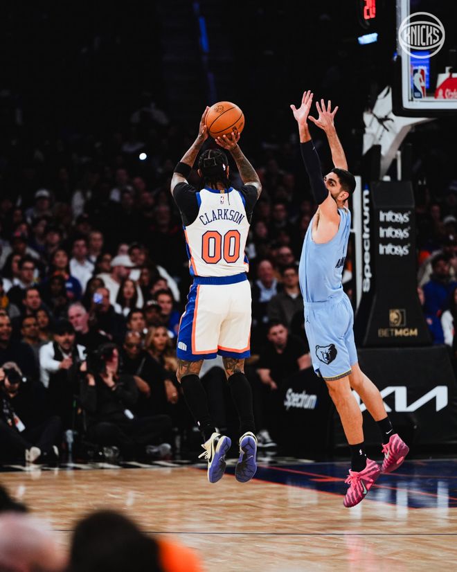 灰熊队开场后反客为主,杰克逊独取5分率队以9-4领先。布里奇斯和沙梅特回敬三分,尼克斯队连拿7分反超。兰代尔上篮追平,15平后唐斯连得3分,尼克斯队再次领跑。两队之后交替得分,布伦森右翼命中三分,哈特两罚全中,首节还有2分55秒时尼克斯队以30-26领先4分。灰熊队追回4分扳平,阿奴诺比连中两球,麦克布莱德弧顶投中三分,他们带领球队以12-0的攻击波结束首节,尼克斯队以42-30领先。 麦克布莱德命中三分,他率队以7-0的小高潮开始第二节,尼克斯队领先19分。莫兰特三分回应,他和杰克逊拿下5分为球队止血,唐斯三分中的,灰熊队打出一波8-3的反击高潮,半场前5分钟时他们追至45-56。克拉克森非常活跃,连得7分帮助球队再次拉开,双方之后各得几分,布里奇斯连进两球,半场前1分钟时尼克斯队以72-52领先20分。阿尔达马突破得手,哈特右翼命中三分,布伦森中投得分,半场结束时尼克斯队以77-54领先23分。