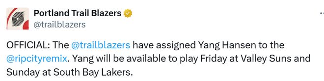 开拓者官宣下放杨瀚森:本周六迎发展联盟首秀