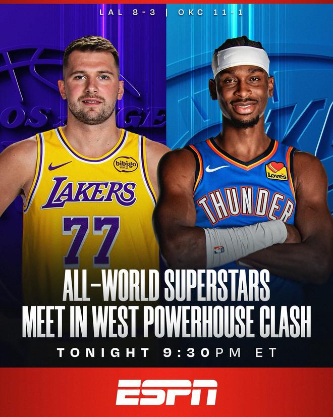 北京时间今日10:30,NBA常规赛迎来焦点对决,目前11胜1负排名全联盟第一的雷霆队在主场迎战8胜3负的湖人队。