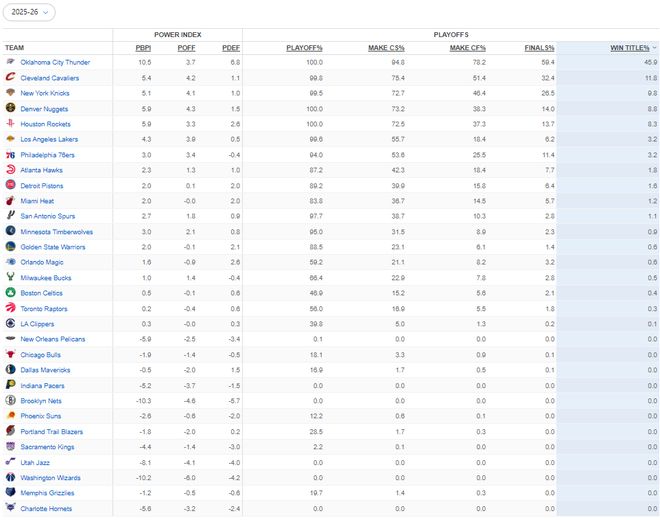 5队大于5%:火箭8.3%,掘金8.8,尼克斯9.8%,骑士11.8%,雷霆45.9% 有了杜兰特以后,火箭以往进攻疲软的问题就解决了,尤其申京的传球越来越娴熟,他也在进化成球星的路上。可惜范弗利特应该是赛季报销了,否则火箭的阵容还能更完美。掘金再次吹起冲冠的号角,约老师依旧无敌,核心球员变化也不大,引进的瓦兰丘纳斯在替补席表现出色,现在的掘金颇具实力。 尼克斯和骑士,是过去几年的东部强队,一直都在对阵容和打法进行优化,他们的目标始终如一,就是打进总决赛甚至是争夺总冠军。不过雷霆的夺冠概率实在夸张,高达45.9%,他们的核心球员都是自己培养出来的,并且都还处于20多岁的最佳年龄,球队也没薪水压力甚至还有许多的选秀权,随时都可以进行补强。目前雷霆是西部第一,这还是二当家杰伦-威廉姆斯没有上场的情况下做到的,从各方面来看,雷霆确实是最大的热门。 声明:个人原创,仅供参考 |