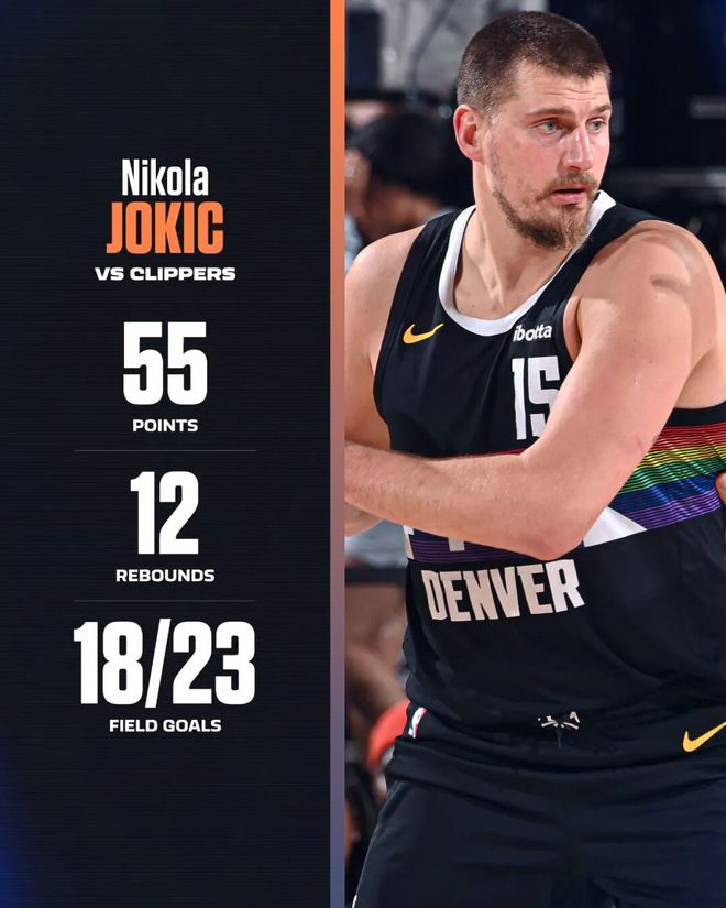 常规赛,掘金130-116大胜快船。 这场比赛,约基奇打出了赛季至今最强个人表现:全场出战33分钟,投篮23中18,三分6中5,罚球16中14,得到55分12篮板6助攻,正负值+28。