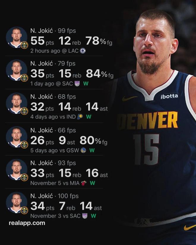 对于约基奇,只能感叹:果然还是现役第一人。 本赛季开局,约基奇相对没有那么炸裂,他在前5场比赛里4次拿下三双,但是没有一场得分超过25分,但是从第六场比赛开始,约基奇又开启了MVP模式。 进入11月至今的6场比赛,约基奇的表现: ——对阵国王,34分7篮板14助攻4抢断,投篮22中14 ——对阵热火,33分15篮板16助攻3抢断,投篮18中12 ——对阵勇士,26分9篮板9助攻,投篮15中12 ——对阵步行者,32分14篮板14助攻,投篮14中10 ——对阵国王,35分15篮板7助攻2抢断,投篮19中16 ——对阵快船,55分12篮板6助攻,投篮23中18 6场比赛,场均35.8分12.0篮板11.0助攻,重点是,投篮一共111投88中,命中率高达79.3%,这种级别的效率和数据,简直闻所未闻——已经不知道怎么形容了,怪物,真的是怪物。