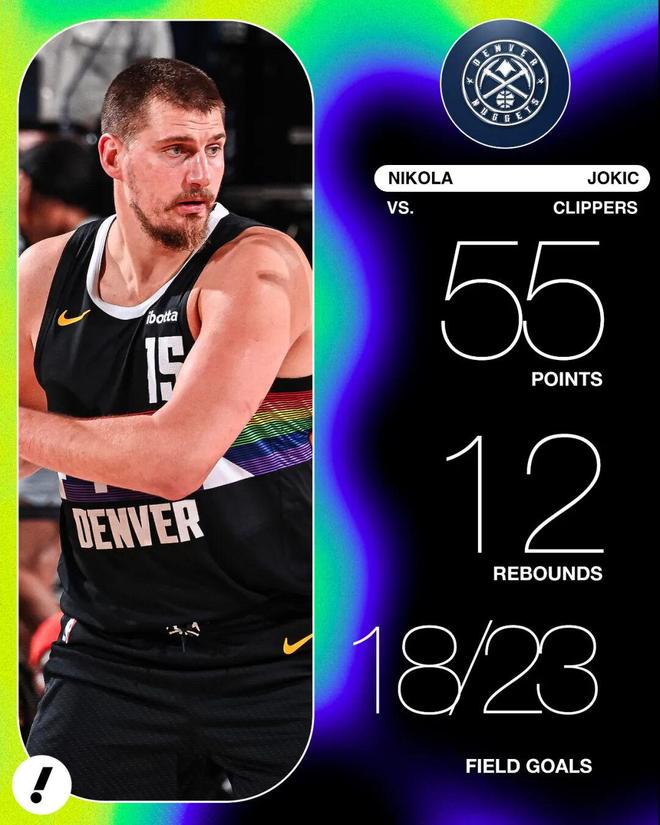 其中第一节,约基奇单节就轰下25分,半场结束,他已经拿到33分,追平个人生涯任意半场得分最高; 半场结束时,掘金还63-68落后5分,关键在第三节,掘金打出一波43-22完成反超,约基奇在这一节又一次接管了比赛,他单节得到19分5篮板4助攻,个人创造得分比快船全队得分都高。 三节结束,约基奇已经拿下52分,刚好与快船首发五人得分一样。 有点可惜的地方在于,第四节因为分差太大,约基奇只打了不到3分钟,最终得分定格在55分。