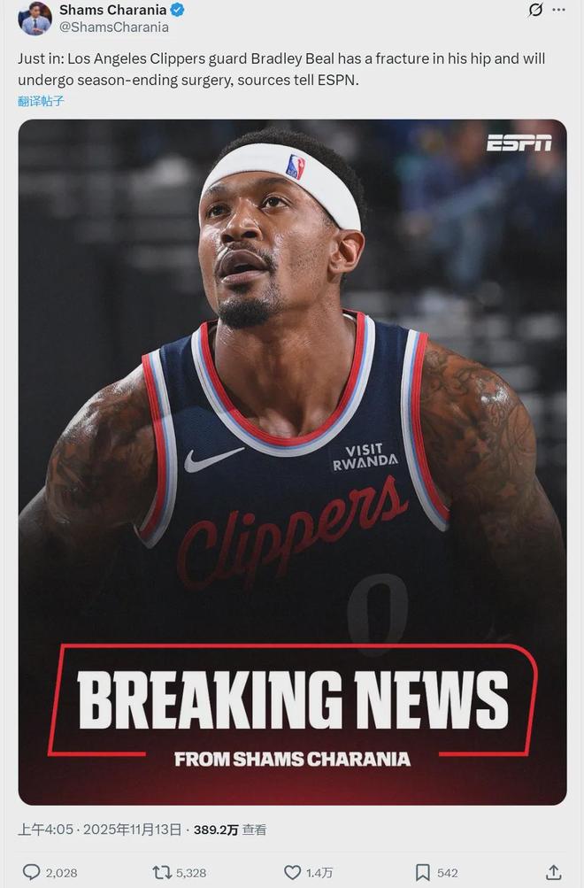 今天早些时候据NBA名记Shams报道,快船后卫布拉德利·比尔遭遇了髋部骨折,他是在上周末跟太阳的比赛里受伤的。 Shams透露,其实快船不希望比尔动手术,但经过全美多位医疗专家和快船医疗团队的会诊,还是确定需要比尔接受手术治疗。