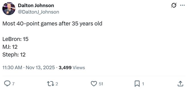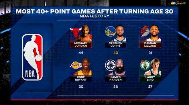 如果进一步将年龄要求提升至35岁,本场则是库里第6次交出40+,成功追平詹姆斯并列历史第一。