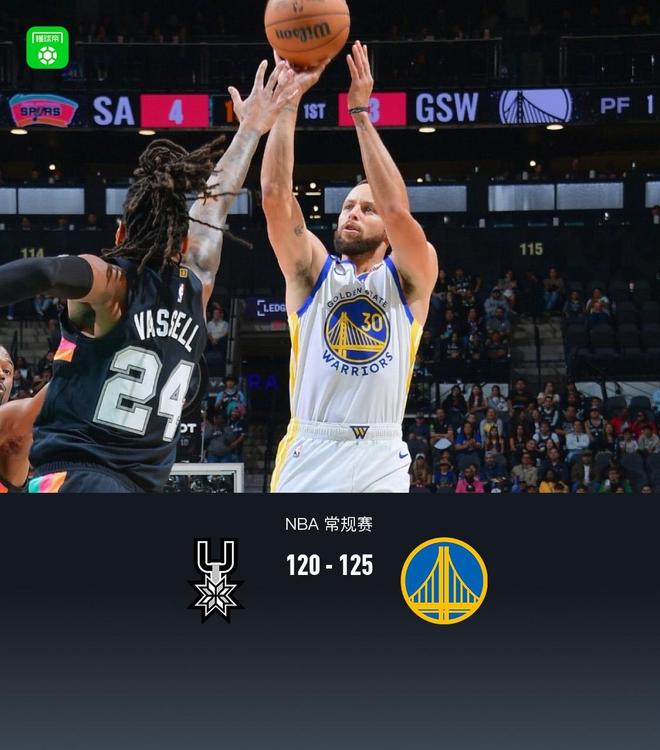 勇士125-120逆转马刺,库里46分,文班亚马31+15+1
