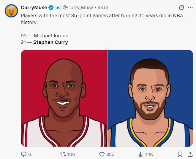 此役库里还有更多的纪录:2.30岁后库里拿到91次35+仅次于乔丹。