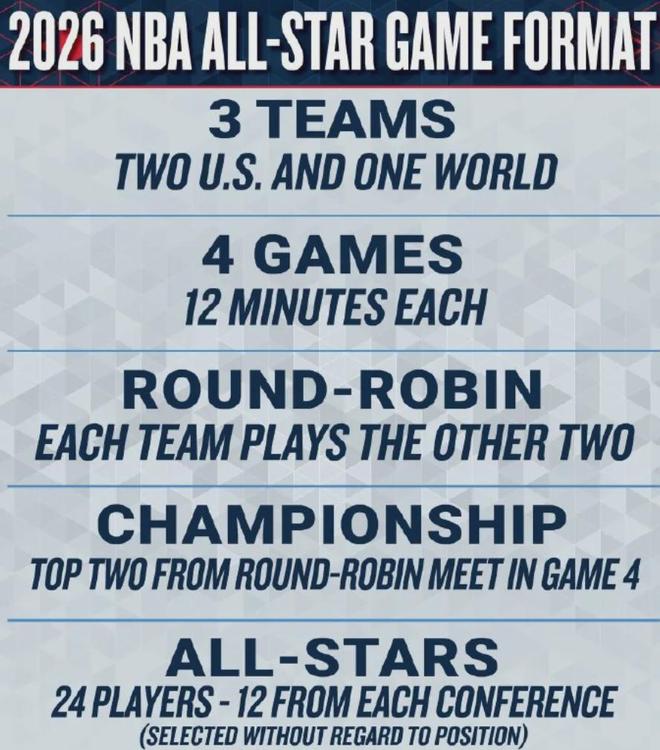 要是三队都是1胜1负,那么就砍净胜分决定晋级资格,总之就是4场对决,每场12分钟。 本次全明星球员选拔也是会取消位置限制。当然,要是凑不齐8名国际球员进入全明星,那么在必要时可以选择具备其他国家背景的美国球员参赛。