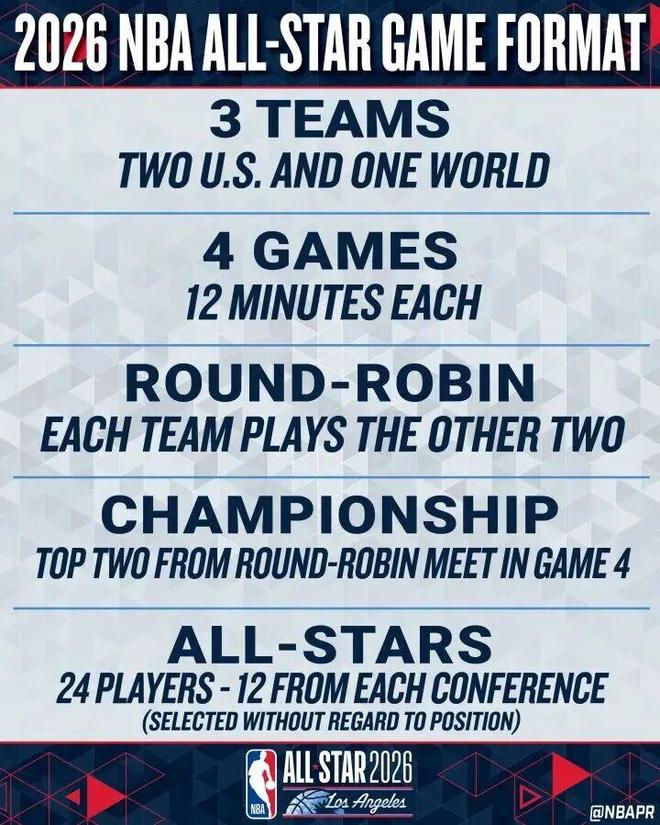 大事很妙,11月12日,NBA官方宣布:2026年NBA全明星赛将采用全新的“美国队VS世界队”赛制。 不得不说这样的赛制的确很有噱头 届时两支由美国球员组成的球队(美国队)和一支由国际球员组成的球队(世界队)将以循环赛制进行竞争,共包括四场 12 分钟的比赛。这三支球队每队至少将有八名球员。 三支队伍实力上能均衡吗? 与以往一样,24 名 NBA 全明星球员(每个分区 12 名)将按以下方式选出:每个分区的首发阵容的五名球员将由球迷(占投票的 50%)、现役 NBA 球员(25%)和媒体小组(25%)投票选出;每个分区的替补阵容的七名球员将由 NBA 主教练选出。今年,全明星球员的选拔将不考虑场上位置。将球员分配给两支美国队的过程将在之后确定。若投票结果无法满足至少16名美国球员、8名国际球员的比例,联盟总裁亚当-萧华将补充人选。 目前的MVP候选榜单前五没有美国球员 只能说现在的男子篮坛,光是美国本土球星组队已经不再像从前那样具有统治力了。实力强悍的国际球员越来越多,甚至出现了文班亚马这样几乎可以说是“外星人”的球员...你现在和我说和他差不多强的还能叫来四个打首发? 文班亚马本赛季继续进化 目前联盟MVP榜前五是清一色的国际球员:亚历山大、约基奇、字母哥、文班亚马和东契奇。想象一下这五个人首发出战,亚历山大和东契奇组成后卫线,字母哥打小前锋,文班亚马和约基奇打内线,这个星球上根本找不到可以和他们抗衡的先发五人... 这俩一起坐镇内线 别人都不知道咋玩了 当然了,现在全明星比赛的激烈程度也是大不如前,球星们更愿意用轻松的氛围给观众带去欢乐。所以,即便硬实力看上去国际球星大幅领先,到时候结果如何还真的不好说。 |