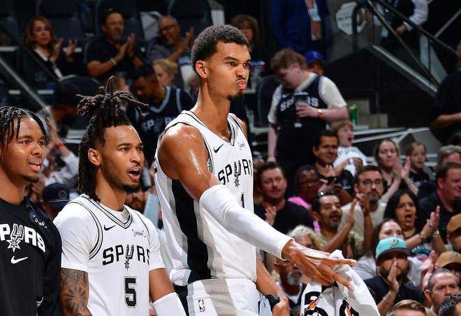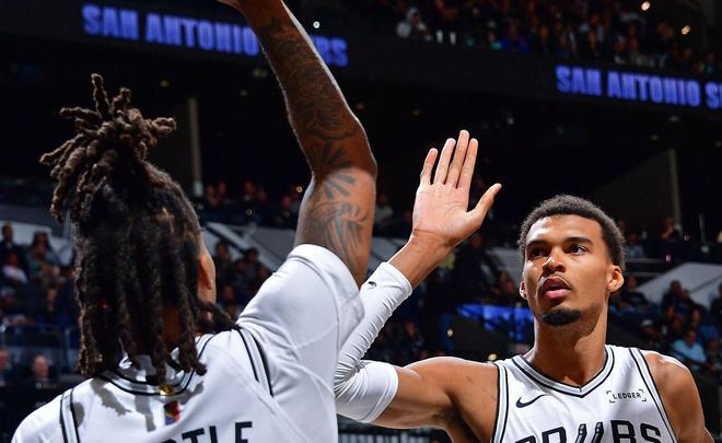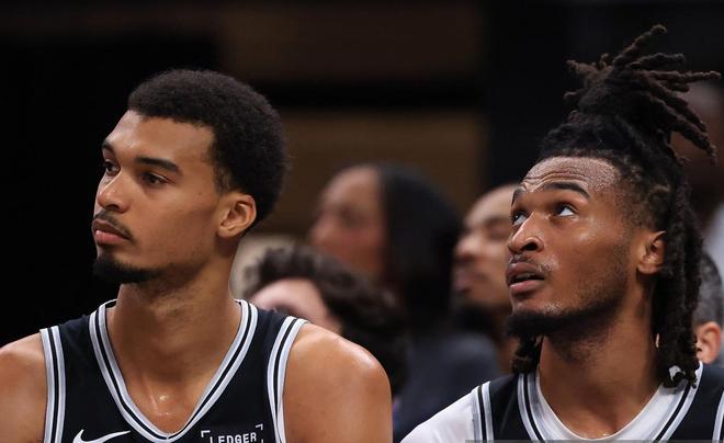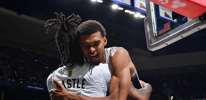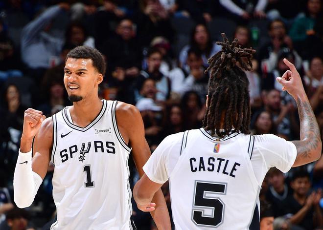 凭借联盟第八的进攻效率和第六的防守效率,其他球队不得不对马刺队刮目相看。 文班亚马的夏天可谓是丰富多彩,足迹遍布全球,而卡斯尔则在休赛期的大部分时间里待在洛杉矶,跟随NBA训练师奥林·辛普利斯(人称“后卫导师”)进行训练。 尽管如此,两人还是抽出时间相处。在马刺队最先进的训练馆——胜利资本训练中心,卡斯尔和文班亚马抓住一切机会观看比赛录像,然后进行模拟演练。随着休赛期进入夏季,这对组合得知福克斯将因腿筋伤势缺席赛季初期的比赛,这使得他们在场上的默契配合对于球队能否迅速进入状态显得尤为重要。 “从那时到现在,我们仍然经常一起看比赛录像,”卡斯尔说道,“挡拆配合、防守战术等等,因为很多时候场上只有我和他两个人。所以,能够了解他的想法,让他也了解我的想法,这对我们来说帮助很大。” 虽然他们的大部分夏季训练都在圣安东尼奥进行,但文班亚马在七月份也前往洛杉矶训练,以加深与卡斯尔的默契。文班亚马在那次旅行中与名人堂成员凯文·加内特探讨了比赛的心理层面,并在与队友于洛约拉马利蒙特大学进行公开训练。前NBA球员帕特里克·贝弗利也参与了这些训练。 “他在那些训练中状态极佳,看起来非常健康,”贝弗利在八月份做客播客节目时说道,“他看起来天赋异禀,简直太厉害了。他转身过人,半个身子都出了界,一只胳膊还卡在篮筐里,就像这样。那简直是世界上最疯狂的动作。” “他能来到这里,让我们在夏季训练营开始之前,在一切正式开始之前,就建立起默契,这绝对很有帮助,”卡斯尔说道,“大量的训练,一起观摩录像,这些都很有帮助,但往往被人忽视。我们整个夏天都在努力做到这一点,现在它开始逐渐成型了。”
