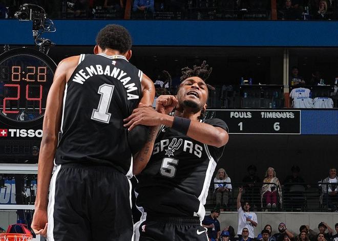 “扣篮!文班!”卡斯尔一边高喊一边运球飞奔推进。这是马刺队赛季揭幕战客场战胜独行侠的第二节的一个画面。几乎就在卡斯尔喊出这句话的同时,文班亚马用右臂顶开紧追不舍的德怀特·鲍威尔,奋力冲向篮筐,完成了最后的加速。在越过中圈标志几步之后,卡斯尔抛出一记高吊球,文班亚马在空中接住球,完成了一记反手双手扣篮。文班亚马和卡斯尔兴奋碰肩庆祝。替补席的马刺球员一阵喧闹,疯狂庆祝这记技惊四座的扣篮。这张海报和随后的庆祝画面迅速在网络上疯传,两位过去两年的年度最佳新秀进行了一次默契配合,并且展现了惊人的天赋。