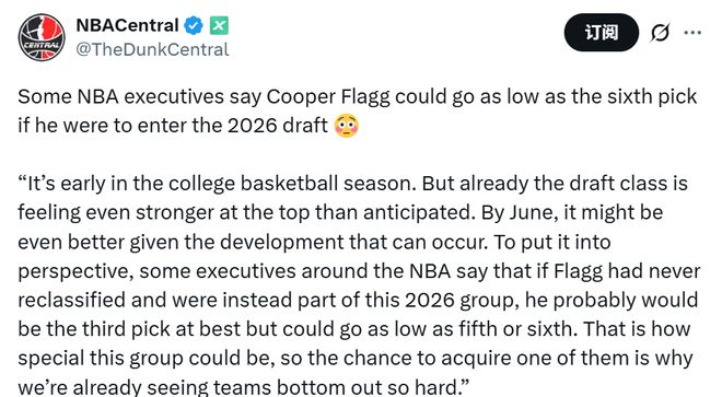 大学篮球赛季才刚刚开始,但这届新秀的头部战力已经超出预期。到明年6月选秀大会时,随着球员的持续成长,整体质量可能还会进一步提升。更直观的对比是,多位NBA球队高管表示,若弗拉格当初没有提前跳级,而是加入2026届选秀,他最多只能排到第3顺位,甚至可能跌至第5或第6顺位。这届新秀的实力之特殊,正是一些球队早早开始疯狂摆烂的原因。 |