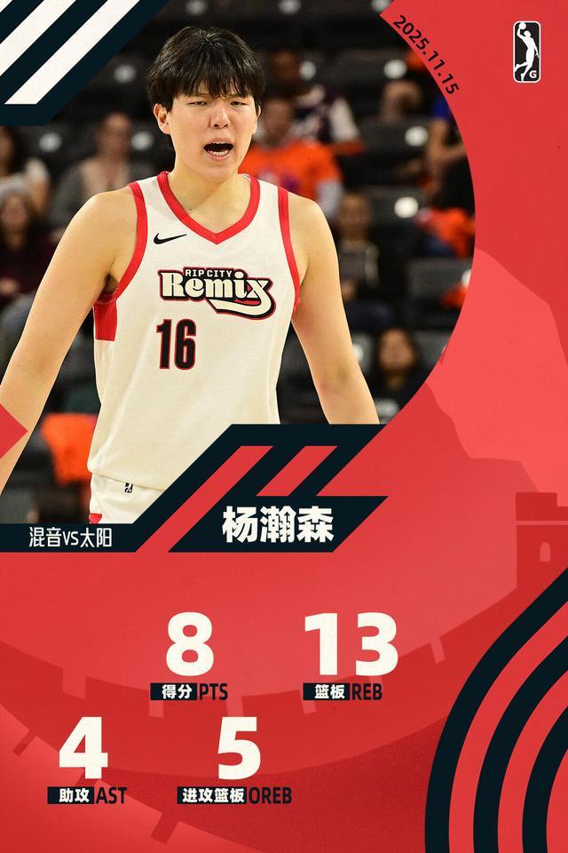 很多时候比赛本身就是如此。 你急于想要做些事情导致神经高度紧绷,你反而什么都做不到。然而一旦你整个人放松下来,找到某一个突破点,然后在某一项自己擅长的事情上理顺了思路,接下来就是一顺百顺。 今天让杨瀚森放松下来的,是他抢到的篮板和送出的助攻。 整场比赛,杨瀚森抢下了全场最高的13个篮板,其中有5个前场篮板;另外他还送出了全队最高的4次助攻,其中第三节单节就有3次助攻入账。 精神放松了,状态和手感也就跟着回来了。虽然这场比赛两次外线出手尝试依然没有命中,但杨瀚森在第三节还是命中了一记罚球线附近的中投。 G联赛的第一步,杨瀚森走的肯定不算漂亮,但足够踏实稳重。8分13篮板4助攻1抢断1封盖的数据,谈不上惊艳,但首战拿到这样的表现,至少可以让大家对他的担心稍微减少那么几分。