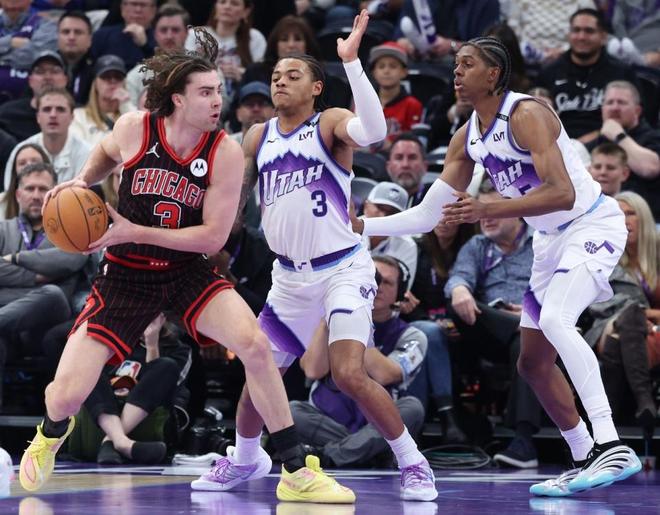 数据统计 爵士:马尔卡宁6记三分47分7篮板,马尔卡宁连续两场轰下40+得分,也是本赛季第3次40+得分。努尔基奇4分14篮板5助攻3抢断,乔治34分6助攻,科利尔16分9助攻,森萨博4记三分16分。 公牛:吉迪复出26分12篮板13助攻2抢断2盖帽,本赛季第3次三双联盟第二,生涯第21次三双。布泽利斯18分6篮板6犯规,武切维奇21分13篮板3盖帽,怀特复出赛季首秀27分8助攻,多森姆18分,菲利普斯10分。 比赛回顾 公牛过去4场连输雄鹿、骑士、马刺与活塞遭遇4连败,爵士上一场主场122-132输给老鹰。本场公牛缺少科林斯,怀特复出赛季首秀,吉迪也复出,爵士缺少李凯尔、凯斯勒、亨德里克斯与尼昂。首节双方均是轰下30+得分展开对攻,公牛开局3-10落后,并在之后17-24落后。公牛持续追分,两队首节均是没有球员得分上双,但借助团队攻势同样打出高得分,首节结束双方维持33-33。公牛三分14中5,吉迪3中0得到2分3助攻,爵士三分16中4,马尔卡宁8中3得到9分。