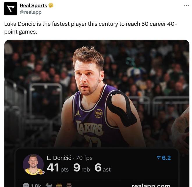 同时东契奇生涯已经第50次单场得40+,仅花费了460场比赛,为21世纪球员中最快。 这让26岁的东契奇成为NBA历史上第4位在27岁前砍下至少50次40+得分的球员,另外三人分别是张伯伦、乔丹和麦卡杜。 而在加盟湖人短短不到两个赛季,东契奇已经6次拿下40+,追平魔术师约翰逊并列队史第十。