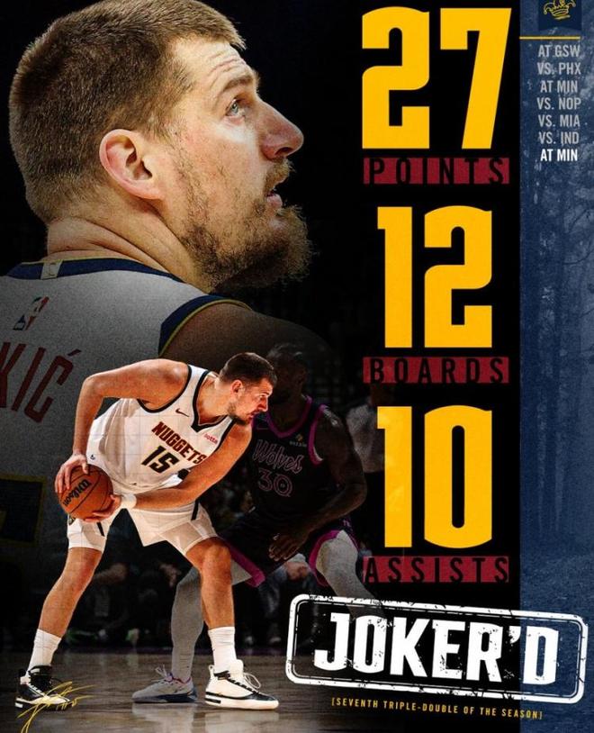 这也是开季以来约基奇表现的缩影,更是过去掘金7连胜期间约基奇表现的缩影。 在7连胜期间,约基奇场均可以轰下34.6分12篮板10.9助攻华丽又全能的数据,同时三项命中率高达71%、55%和88%,真实命中率更是为夸张的81.8%。 更重要的是,约基奇拿下如此华丽的数据完全不是强求,而是能力碾压水到渠成,当队友手感出色时,约基奇往往会降低出手数,化身组织者为队友创造轻松得分的机会,但当比赛陷入绝境与艰难时刻时,约基奇又会秒切回绝对核心角色,通过无解的个人进攻解决问题。
