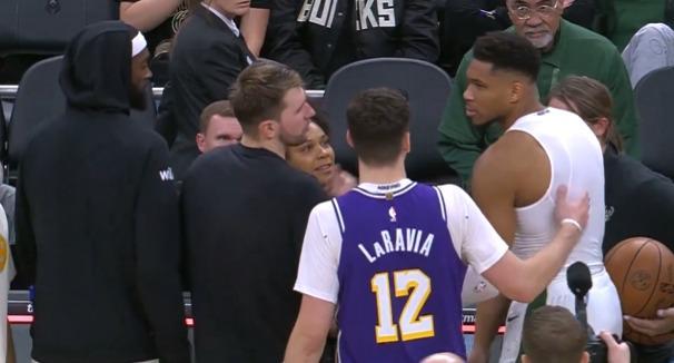 东契奇拿到了比赛用球,拍了拍字母哥的胸口表示感谢。